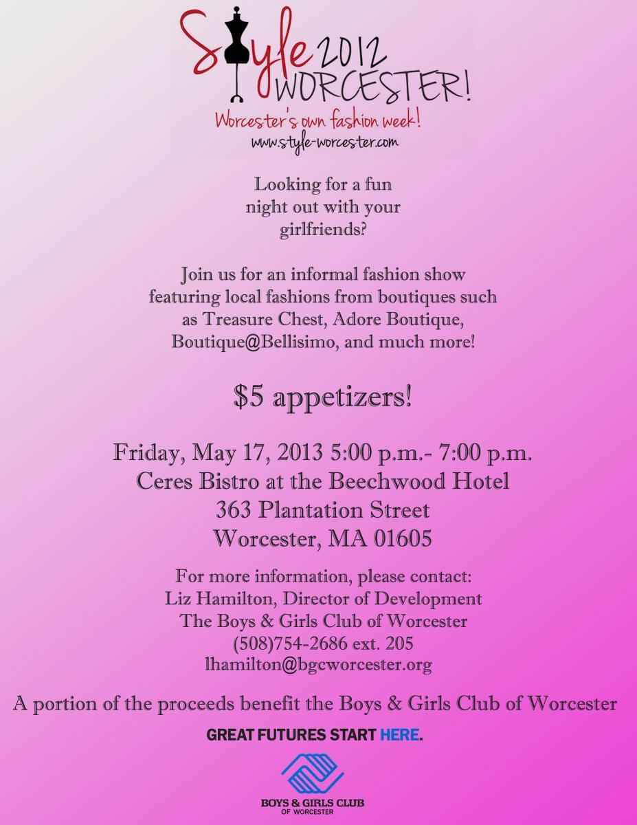 Looking for a girls night out? StyleWorcester is holding an informal fashion show featuring local fashions from boutiques such as Treasure Chest, Adore Boutique and much more! Please join us on Friday, May 17th, 5:00 p.m.- 7:00 p.m. at Ceres Bistro at the Beechwood Hotel, located at 363 Plantation Street Worcester, MA 01605. A portion of the food and beverage proceeds will benefit the Boys & Girls Club of Worcester. For more information, please contact Liz Hamilton, Director of Development, at (508)754-2686 ext. 205 or lhamilton@bgcworcester.org.