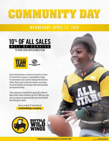 Looking for a good place to have lunch/dinner? On Wednesday, April 22nd, Buffalo Wild Wings located on 476 Boston Turnpike in Shrewsbury, will be donating 10% of all sales to the Boys & Girls Club of Worcester. This is the second time Buffalo Wild Wings has hosted their “Community Day”, and we are so grateful that they have chosen our Club to receive the proceeds. Thank you Buffalo Wild Wings!