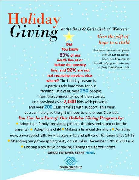 - Adopting a child for the holidays by providing one or more gifts for a Club member, age 8-12.