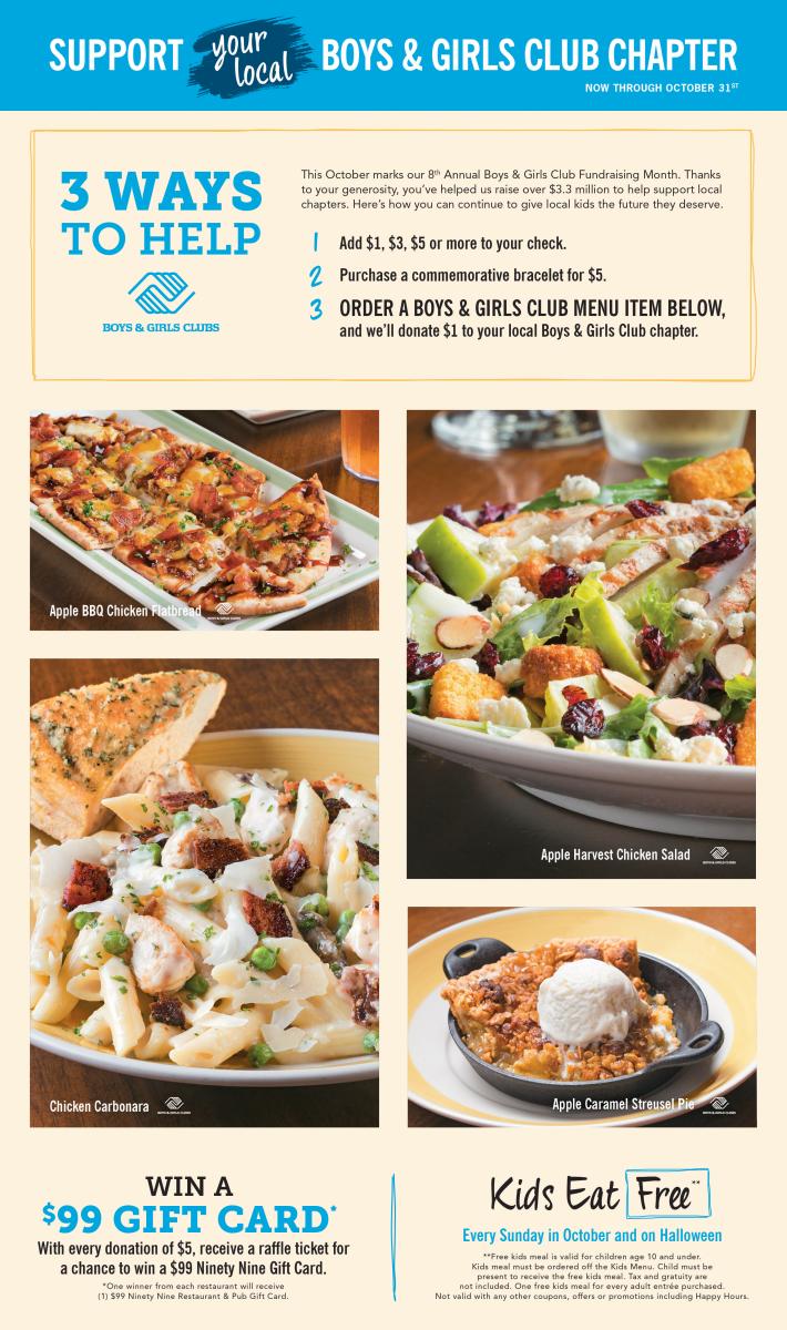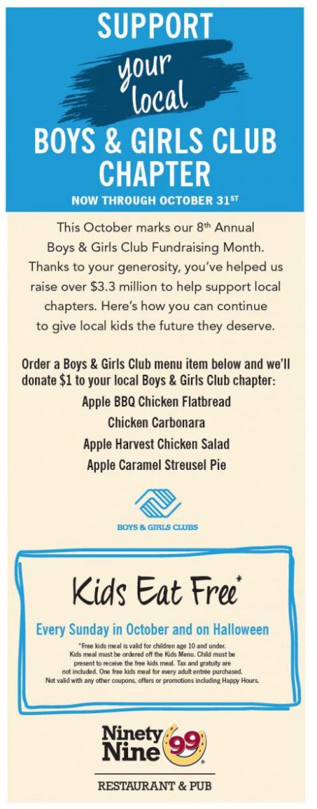 It’s that time of year again! The 99 Restaurants are hosting their 8th annual “Boys & Girls Club Month” at all of their locations (E. Central Street, West Boylston Street, and Southwest Cuttoff) from now until October 31st. When you order a meal listed on the flyer below, partial proceeds will benefit the Boys & Girls Club of Worcester. Our teens will also be making guest appearances at the West Boylston Street, Southwest Cutoff, and E. Central Street locations on Fridays throughout October. As if that wasn’t enough, KIDS EAT FREE on Sundays and on Halloween! Children must be under 10 years old. The 99 Restaurant has been a dedicated supporter of our Club, and proceeds from their “Boys & Girls Club Month” have provided countless opportunities for our kids. We are extremely fortunate to have them as community partners.