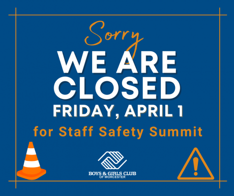 All sites for the Boys & Girls Club of Worcester including Harrington Clubhouse, licensed School Aged Child Care (upstairs at Harrington), Great Brook Valley & Plumley Village will be closed this Friday, April 1 for a Staff Safety Summit.