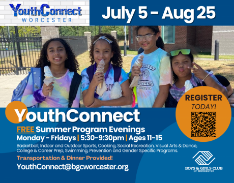 Join the Boys & Girls Club of Worcester for a FREE Summer YouthConnect program for Ages 11 to 15.