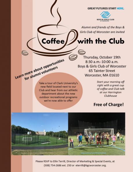 Are you an alum of the Boys & Girls Club of Worcester or someone who would like to learn more about our programs and how to get involved? Please join us on Thursday, October 19th for “Coffee with the Club” from 8:30 a.m.-10:00 a.m. at our Harrington Clubhouse. Start your day off with coffee and bagels with members of our staff and fellow community members as we take tours of Clark University’s new track and field located next to our Club and learn about the new athletic programs we are now able to offer because of this fantastic addition. This is event is free of charge! Please RSVP to Ellin Terrill, Director of Marketing and Special Events, at eterrill@bgcworcester.org. We hope to see you there!
